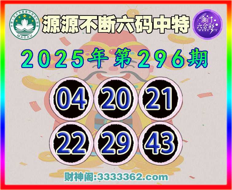 296期:【源源不断】 ☺️六码中特☺️【04.20.21.22.29.43】开:22