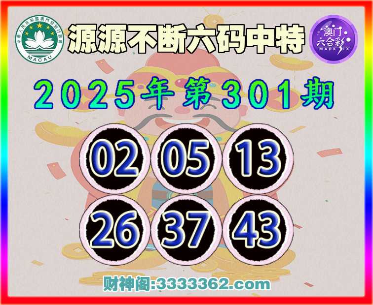 301期:【源源不断】 ☺️六码中特☺️【02.05.13.26.37.43】开:05