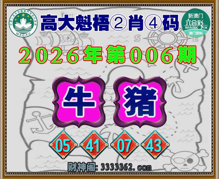 006期: 🏆『高大魁梧』 🏆②肖④码🏆【牛猪】【05.41.07.43】开:00准