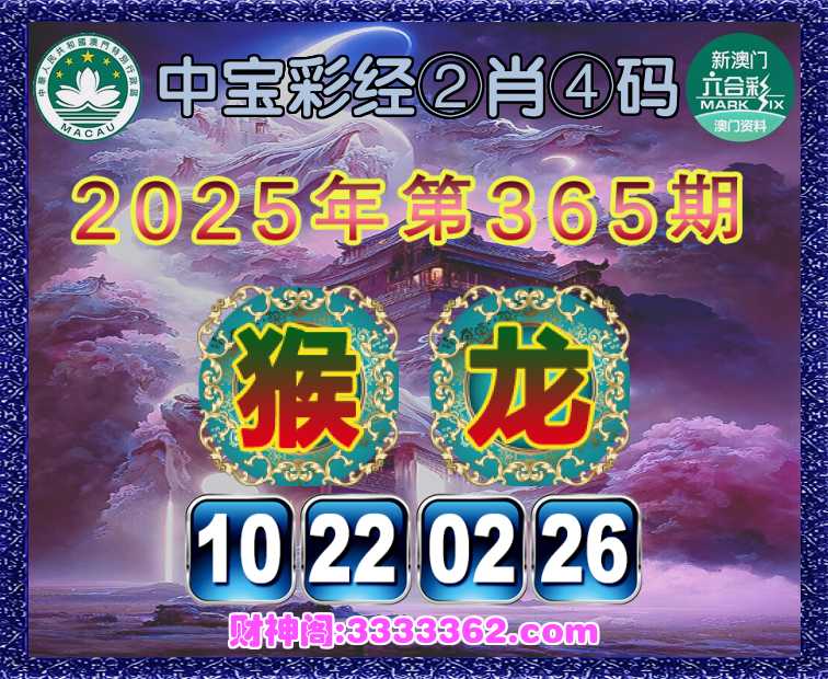 365期:《中宝彩经》 🎖️②肖④码🎖️【猴】【10.22.02.26】开:龙26