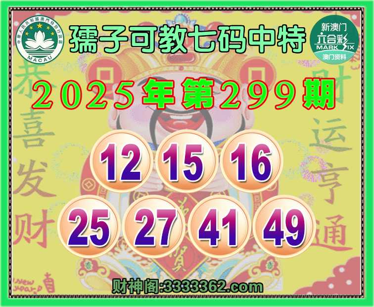 299期:【孺子可教】 🥬七码中特🥬【12.15.16.25.27.41.49】开:49
