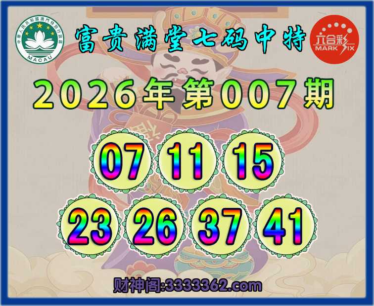 007期:【富贵满堂】 ☺️七码中特☺️【07.11.15.23.26.37.41】开:41