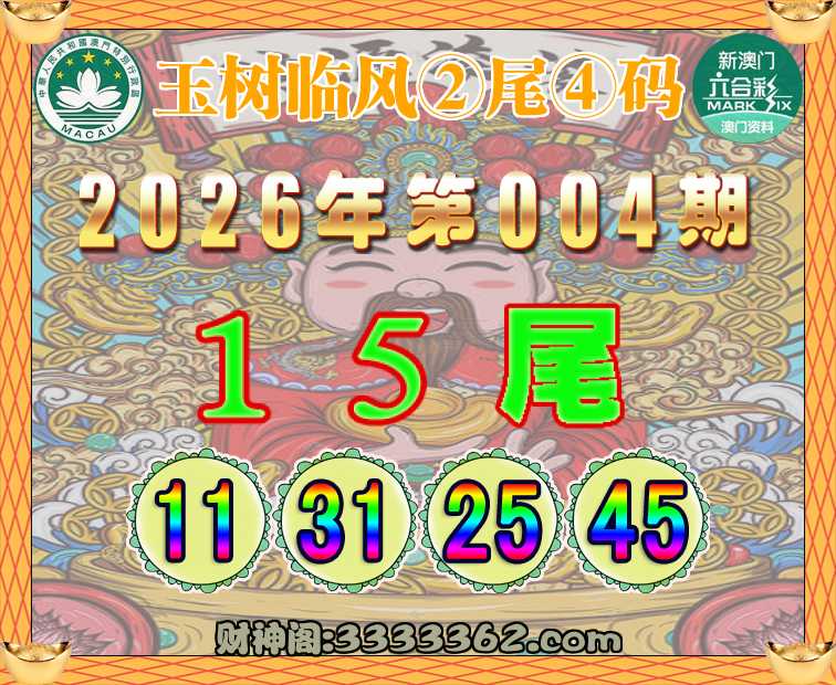 004期: 玉树临风  ♣️②尾④码 ♣️【15尾主:11.31.25.45】开:45